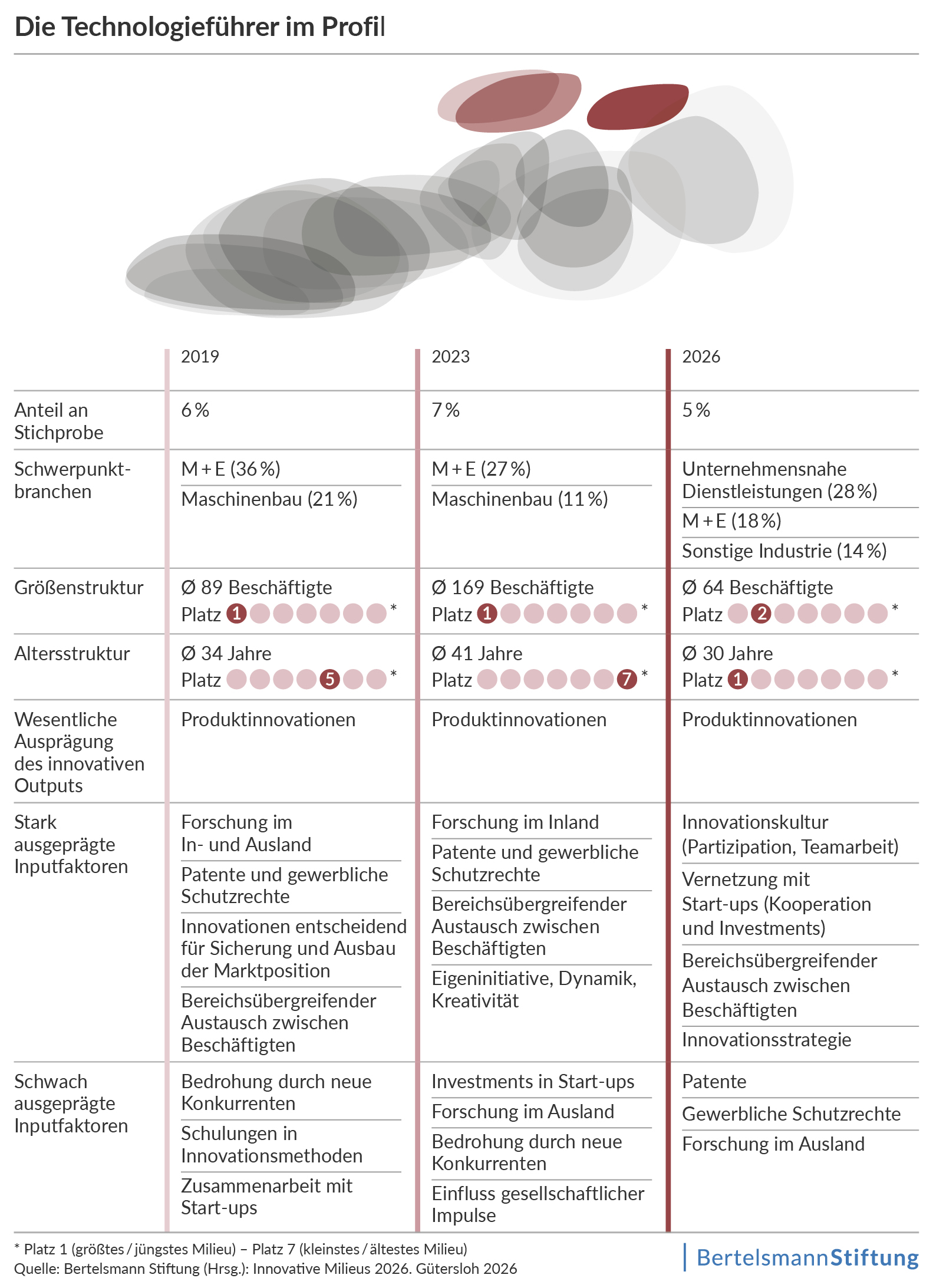 Während die Technologieführer 2019 und 2023 noch stark von großen Industrieunternehmen geprägt waren, wird das Milieu 2026 zunehmend von kleineren Unternehmen aus wissensintensiven Dienstleistungen und der Digitalwirtschaft getragen.