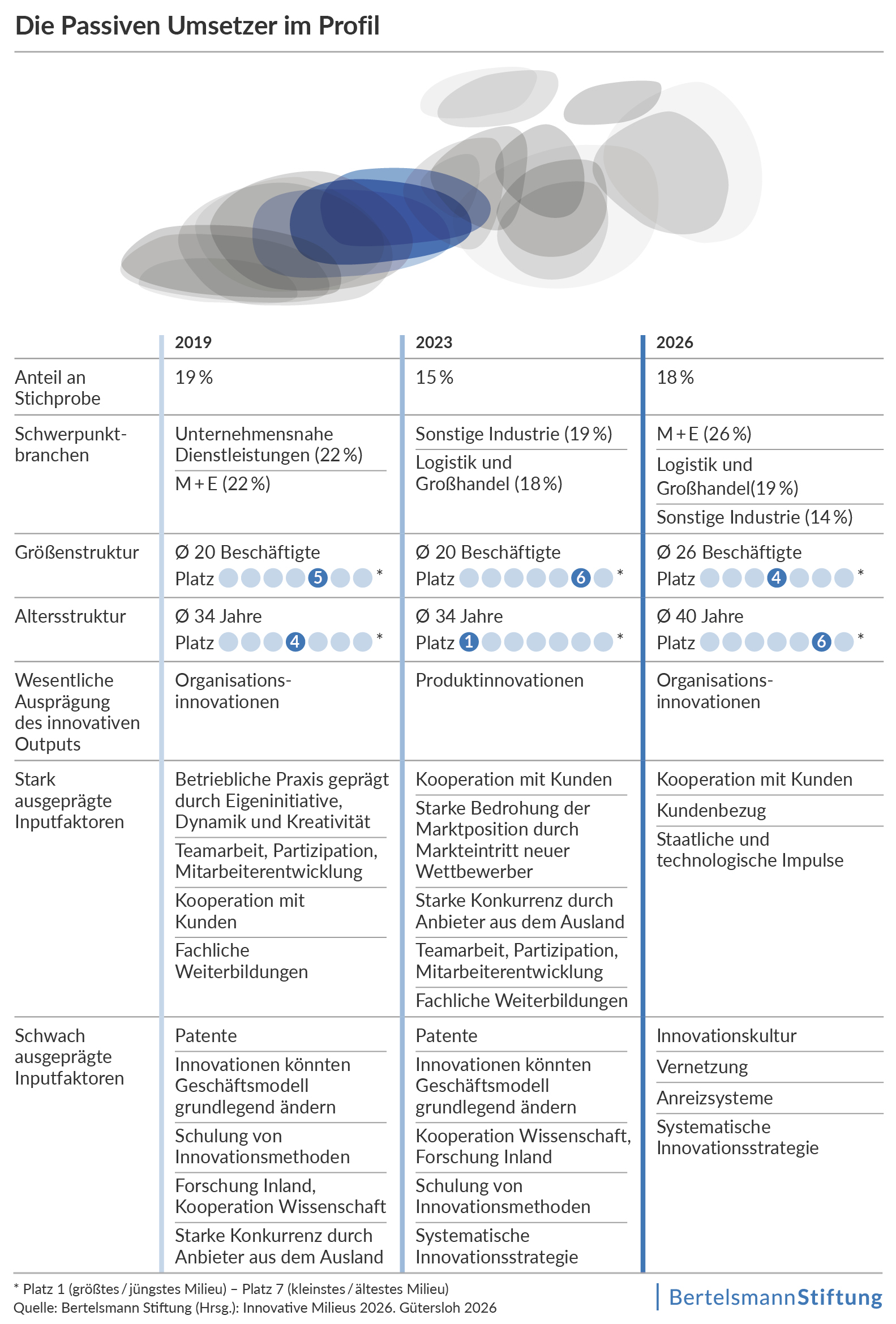 Die Passiven Umsetzer machen 2026 rund 18 Prozent aller Unternehmen aus, nachdem ihr Anteil 2019 bei rund 19 Prozent und 2023 bei etwa 15 Prozent lag, womit sich ein moderater Rückgang gegenüber 2019 auf niedrigerem Niveau verstetigt.