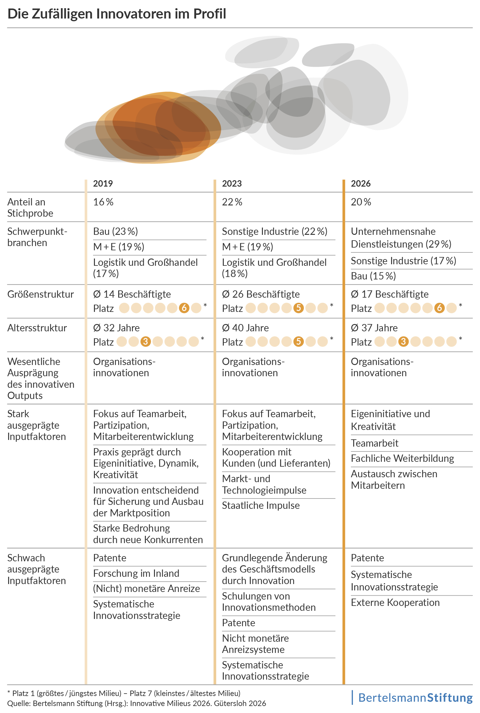Die Zufälligen Innovatoren machen 2026 rund 20 Prozent aller Unternehmen aus, nachdem ihr Anteil 2019 bei rund 16 Prozent und 2023 bei etwa 22 Prozent lag. Sie sind 2026 das zahlenmäßig stärkste Milieu der deutschen Unternehmenslandschaft.