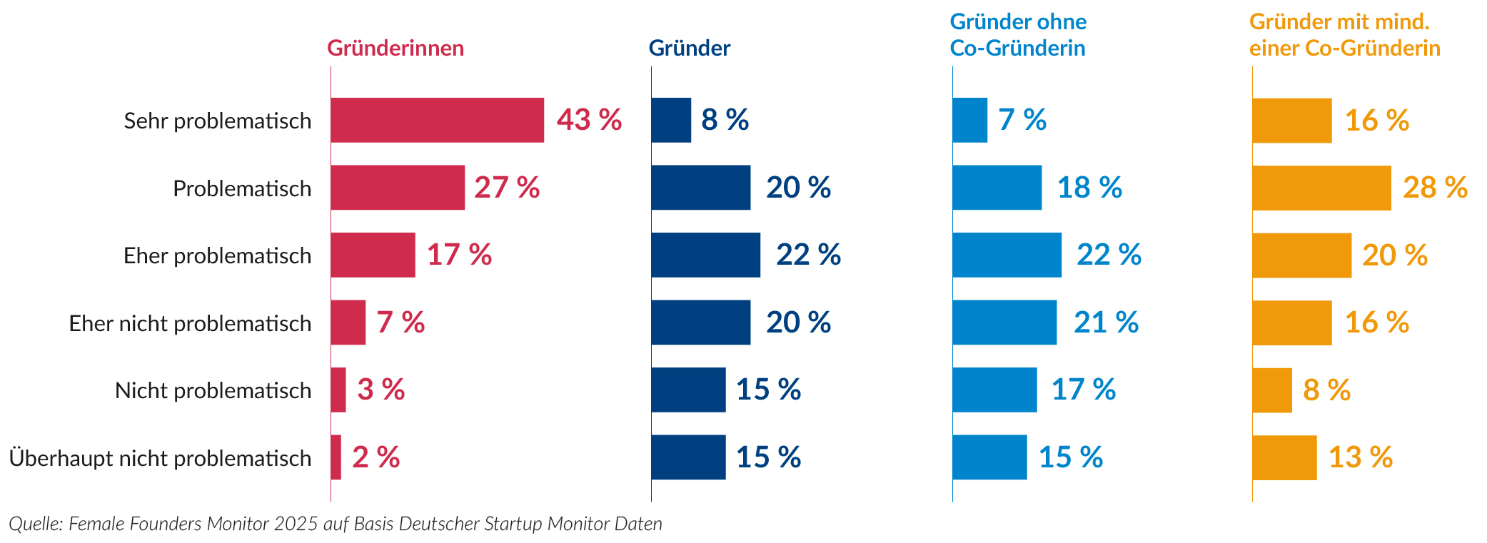 Dass mangelnde Geschlechterdiversität ein Problem für den Startup-Sektor sein kann, ist dort noch nicht ausreichend durchgedrungen. Laut Monitor zeigt sich, dass der Gendergap kaum als Problem wahrgenommen wird. Nur 8 Prozent der Gründer halten das für sehr problematisch, gegenüber 43 Prozent der Gründerinnen. Gründen in gemischten Teams scheint mangelndem Problembewusstsein entgegenzuwirken, denn hier sehen doppelt so viele Männer den Gendergap sehr kritisch.
