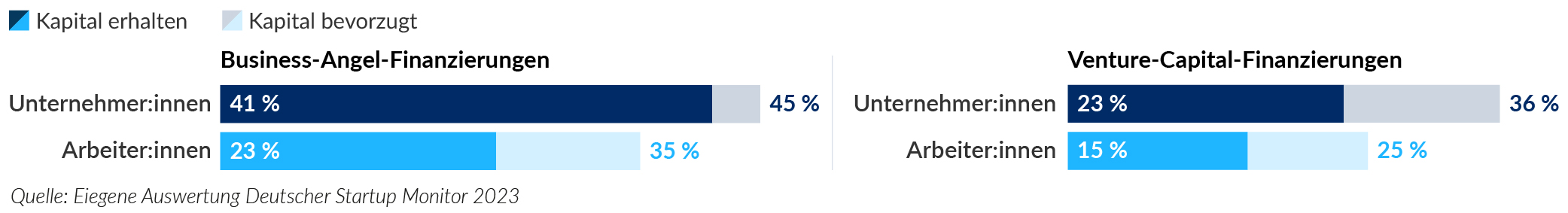 Beim Unternehmensaufbau von besonders innovativen Unternehmen zeigt sich wiederum ein Vorteil für Gründer:innen mit Unternehmer:inneneltern: Sie sammeln häufiger als Gründer:innen aus Arbeiter:innenfamilien externes Kapital ein (63 vs. 46 %) - für Startups besonders wichtig, weil es als Grundlage für Produkt- und Serviceentwicklung dient. Stammt es von Business Angeln, geht es oft mit weichen Faktoren wie Kontaktanbahnung, Netzwerken und Branchenkenntnissen einher und erleichtert den Zugang zu Wagniskapitel für den nächsten Wachstumsschritt. Hier sind Gründer:innen aus Unternehmer:innenfamilien weitaus erfolgreicher als solche aus Arbeiter:innenhaushalten (41 vs 23 %). Dementsprechend streben Letztere auch seltener Venture Capital an. Eine Folge: Startups, die wenig externes Kapital aufnehmen, wachsen langsamer, wie sich unter anderem an der Zahl der Mitarbeiter:innen festmachen lässt.